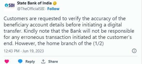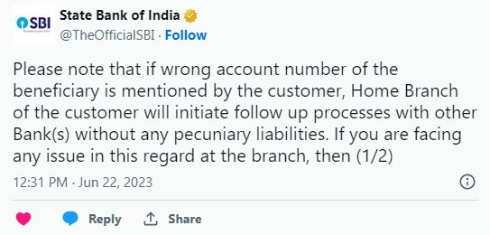 SBI की ओर से एक ग्राहक द्वारा पूछे गए सवाल के जवाब में ट्वीट किया गया कि अगर पैसे गलत खाते में ट्रांसफर हो गया है तो आपको क्या करना है। साथ ही बैंक ने कहा ने बताया कि अगर किसी से गलत खाते में ट्रांसफर हो गया है तो बैंक इसके लिए जिम्मेदार नहीं होगा। इस कारण कोई भी लेनदेन करते समय अकाउंट डिटेल को वेरिफाई कर लेना चाहिए।