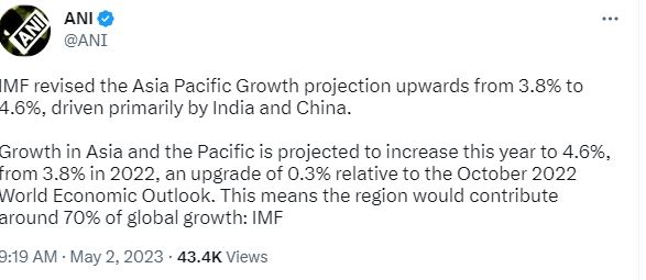 आईएमएफ ने बताया है कि एशिया-प्रशांत क्षेत्र की वृद्धि दर चालू वित्त वर्ष में 4.6 प्रतिशत रह सकती है, जो कि 2022 में 3.8 प्रतिशत थी। अक्टूबर 2022 में वर्ल्ड इकोनॉमिक आउटलुक रिपोर्ट में दिए गए अनुमान से ये 0.30 प्रतिशत अधिक है। इस वृ्द्धि में सबसे अधिक योगदान भारत और चीन की अर्थव्यवस्था का होगा।