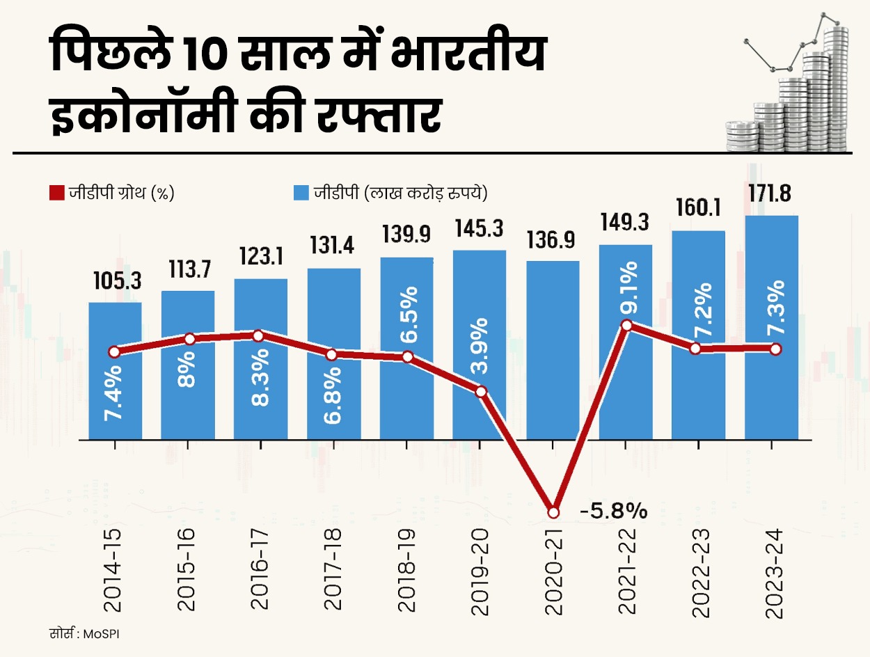 Indian Economy 2024 भारत की अर्थव्यवस्था ज्यादातर मोर्चों पर काफी बेहतर प्रदर्शन कर रही है। आर्थिक और राजनीतिक स्थिरता के चलते निवेश का माहौल बेहतर हो रहा है। शेयर मार्केट रिकॉर्ड ऊंचाइयों पर है। राजकोषीय घाटा भी लगातार कम हो रहा है। इन सब सकारात्मक पहलुओं का असर भारत की जीडीपी ग्रोथ पर भी दिख रहा है जो साल 2024 में सबसे तेज रहने वाली है।