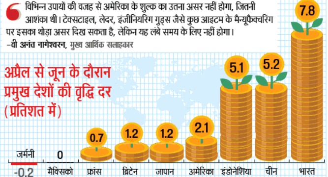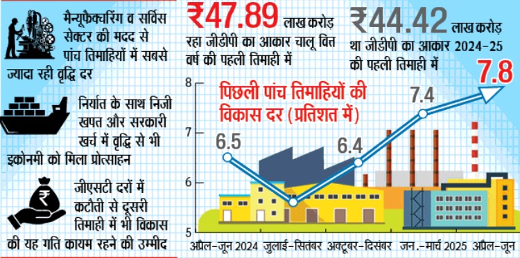 अमेरिका के राष्ट्रपति डोनाल्ड ट्रंप ने अप्रैल में सभी देशों पर 10 प्रतिशत अतिरिक्त टैरिफ लगा दिया था। इसके बावजूद अप्रैल-जून के दौरान भारत ने पांच तिमाही में सबसे तेज ग्रोथ दर्ज की है। इससे पहले इससे अधिक ग्रोथ रेट जनवरी-मार्च 2024 में 8.4 प्रतिशत थी। बड़ी अर्थव्यवस्थाओं में सबसे तेज विकास दर भारत की ही है। अप्रैल-जून 2025 में चीन की विकास दर 5.2 प्रतिशत रही थी।