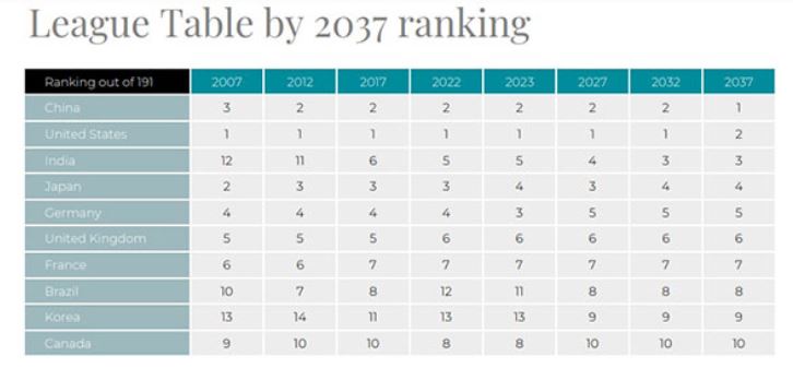 CEBR की ओर से जारी की जाने वाली वार्षिक वर्ल्ड इकोनॉमिक लीग टेबल 2023 में बताया गया कि अगले पांच सालों में भारतीय अर्थव्यवस्था औसत 6.4 प्रतिशत की दर से बढ़ेगी। उसके बाद अगले नौ सालों का गति औसत 6.5 प्रतिशत रह सकती है। इस विकास दर से लगता है कि 2022 में इकोनॉमिक लीग टेबल में पांचवें स्थान पर कायम भारत 2037 में तीसरे स्थान पर पहुंच सकता है। यह वह साल होगा जब दुनिया में चीन पहले, अमेरिका दूसरे स्थान पर कायम होगा।