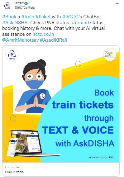 IRCTC की ओर से यात्रियों की सुविधाओं को ध्यान में रखते हुए चैटबोट AskDISHA2.0 को बनाया गया है। यह एक एआई वर्चुअल असिस्टेंस है। इसके माध्यम से यात्री अपना पीएनआर स्टेटस रिफंड स्टेटस बुकिंग हिस्ट्री और अन्य चीजें भी चेक कर सकते हैं।