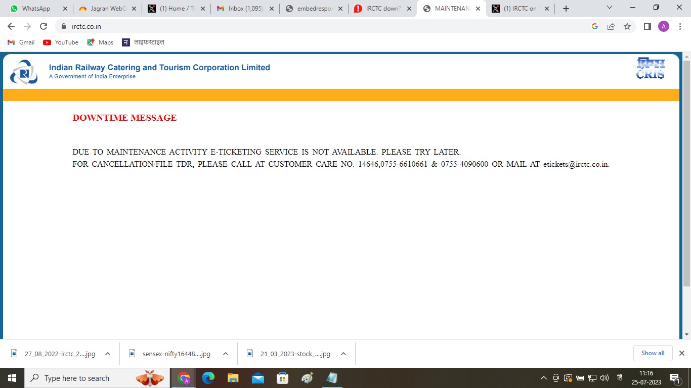 आईआरसीटीसी की वेबसाइट पर लॉग करने पर लिखा आ रहा है कि मेंटेनेंस कार्य के चलते ई-टिकटिंग की सुविधा अभी प्रभावित है। सुविधा का लाभ उठाने के लिए बाद में कोशिश करें। केंसिलेशन के लिए कस्टमर केयर नंबर 14646,0755-6610661 और 0755-4090600 या फिर आधिकारिक मेल आईडी पर etickets@irctc.co.in संपर्क कर सकते हैं।