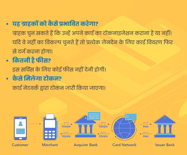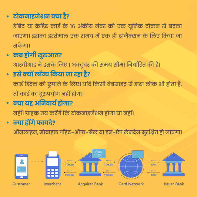 टोकेनाइजेशन एक ऐसी प्रक्रिया है, जिसमें आपके क्रेडिट या डेबिट कार्ड की डिटेल को एन्क्रिप्टेड कोड में बदल दिया जाएगा। इसे ही टोकन के नाम से जाना जाता है। प्रत्येक टोकन, कार्ड को जारी करने वाले बैंक, उपयोगकर्ता और डिवाइस का एक अनूठा संयोजन है। व्यापारी और पेमेंट कंपनियां इन टोकन का उपयोग ही लेन-देन के लिए करेंगी और उनको किसी भी हालात में ग्राहक की जानकारियां सहेजने की अनुमति नहीं दी जाएगी।