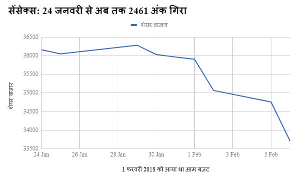 1 फरवरी को पेश हुए आम बजट के बाद से ही बाजार में बिकवाली देखने को मिल रही है। बजट वाले दिन भी भारी उथल-पुथल नजर आई थी। कुल मिलाकर बजट से पहले जो बाजार नई ऊंचाइयों पर पहुंच रहा था, बजट के बाद भारी गिरावट दिखाई दे रही है। 24 जनवरी से अब तक सेंसेक्स करीब 2461 अंक गिर चुका है। 24 जनवरी को जहां 36,161 अंक के स्तर पर था, वहीं 6 फरवरी, मंगलवार को 11.11 बजे 995.98 अंकों की गिरावट के साथ 33761.18 के स्तर पर है।
