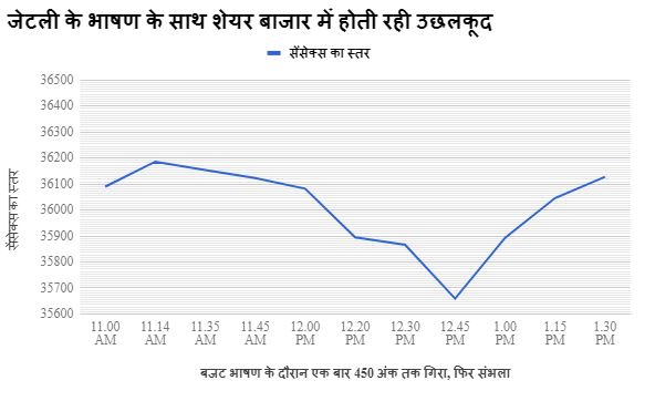 बजट भाषण के दौरान शुरू में सेंसेक्स सकारात्मक रहा। जब वित्त मंत्री ने किसानों और रोजगार को लेकर बड़े ऐलान किए तो यह 180 अंक तक चढ़ गया था, लेकिन जैसे ही टैक्स स्लैब में कोई बदलाव नहीं होने और सेस बढ़ने की खबर आई, सेंसेक्स में गिरावट शुरू हो गई और यह 450 अंक तक नीचे आ गया था।