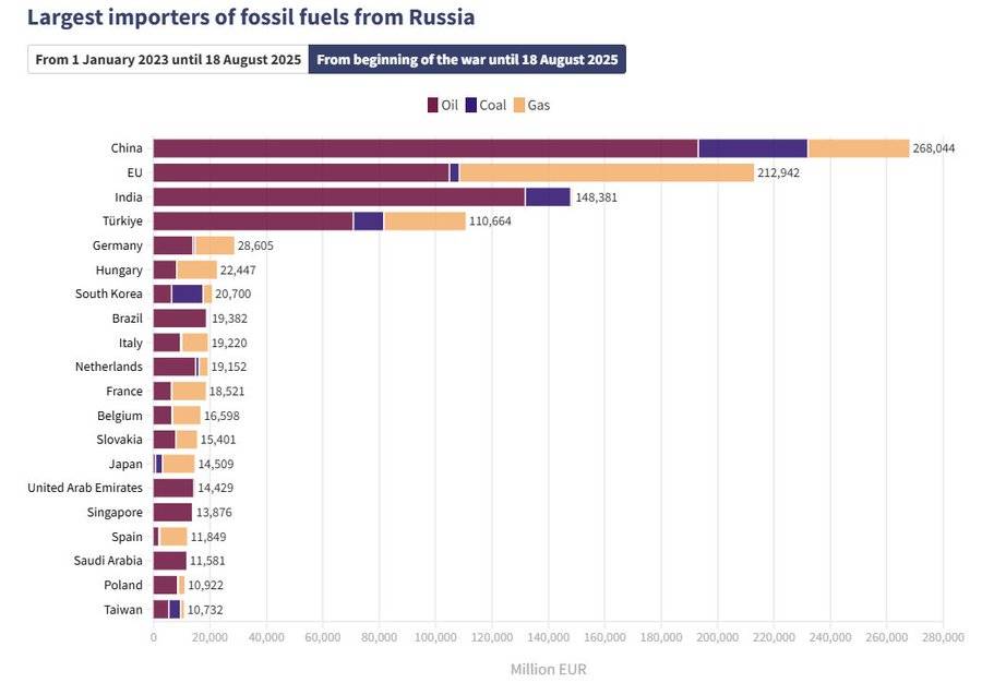 डेटा के अनुसार 1 जनवरी 2023 से 18 अगस्त 2025 तक चीन ने रूस से 268,044 मिलियन यूरो का तेल, कोयला और गैस का आयात किया। वहीं, इस दौरान यूरोपियन यूनियन ने 212,942 मिलियन यूरो का तेल, कोयला और गैस रूस से आयात किया। बात अगर भारत की करें तो इस अवधि में भारत ने रूस से 148,381 मिलियन यूरो का तेल और कोल आयात किया।