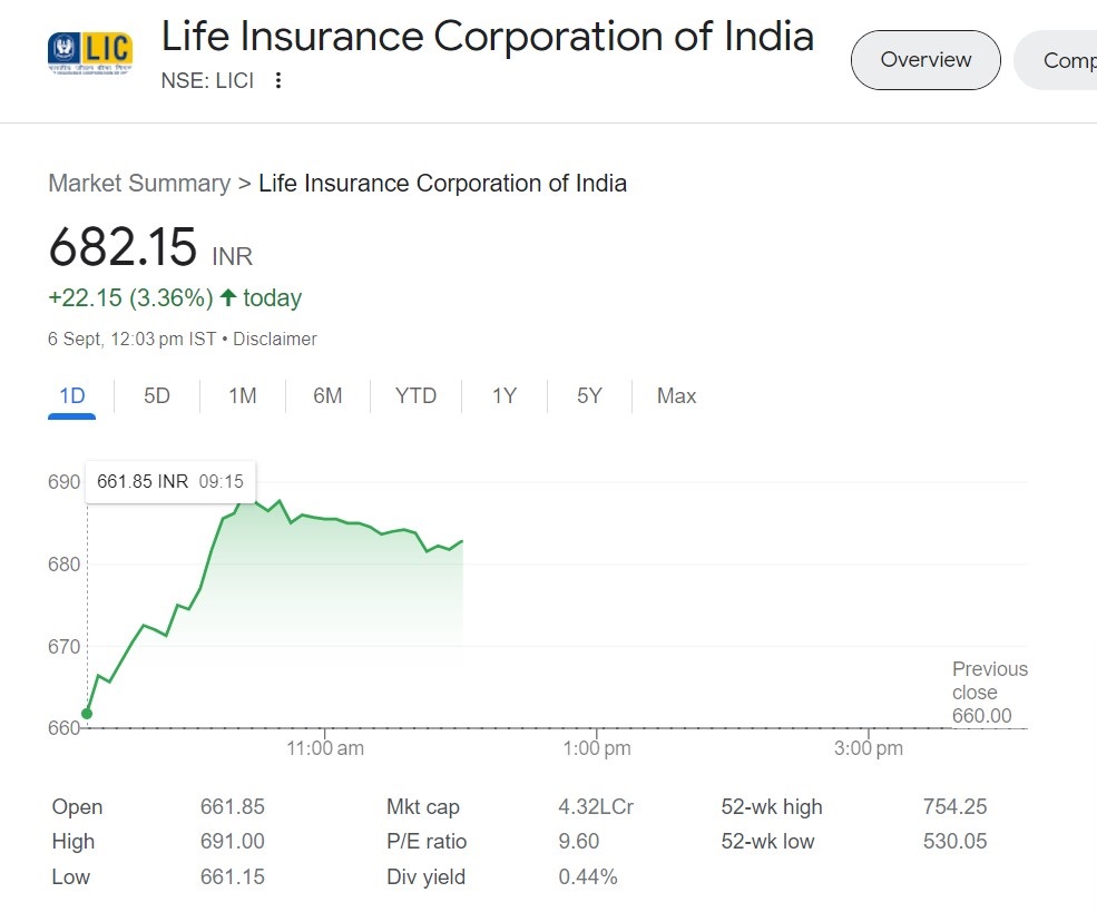 कारोबारी सत्र की शुरुआत में एलआईसी का शेयर 661.85 पर खुला। अब तक के कारोबारी सत्र में शेयर ने 691 का उच्चतम स्तर छुआ है। दोपहर 12 बजे शेयर 3.36 प्रतिशत की तेजी के साथ 682.15 पर कारोबार कर रहा था। एलआईसी के शेयर में पिछले तीन महीने में 14 प्रतिशत की वृद्धि दर्ज की गई है। हालांकि, YTD (Year To Date) आधार पर ये फ्लैट बना हुआ है।
