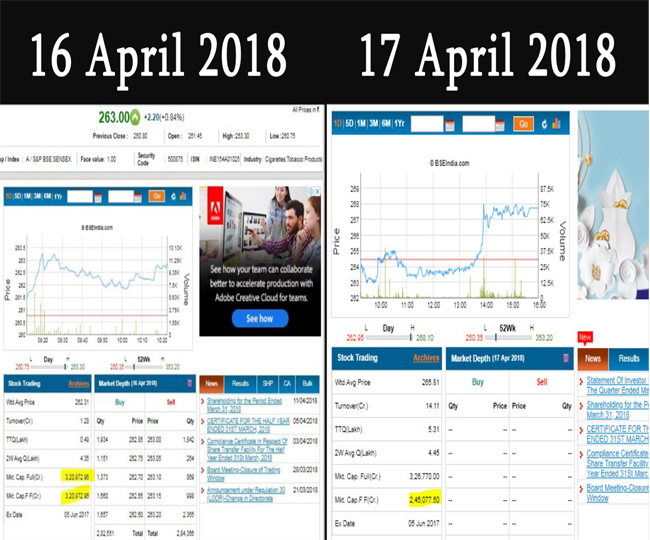 नई दिल्ली (शुभम शंखधर)। बॉम्बे स्टॉक एक्सचेंज की वेबसाइट पर एफएमसीजी कंपनी ITC के फ्री फ्लोट बाजार पूंजीकरण में मंगलवार को बड़ा बदलाव किया गया है। सोमवार को सुबह करीब 10 बजे बॉम्बे स्टॉक एक्सचेंज की वेबसाइट पर आइटीसी का फ्री फ्लोट बाजार पूंजीकरण 3,20,972 करोड़ रुपए था, जिसे आज अचानक 75895 करोड़ रुपए कम करके 2,45,077 करोड़ रुपए कर दिया गया। गौरतलब है कि किसी कंपनी का मार्केट कैपिटलाइजेशन उसके ट्रेड के लिए उपलब्ध कुल शेयरों की संख्या को शेयर के बाजार भाव से गुणा करने पर मिलता है।