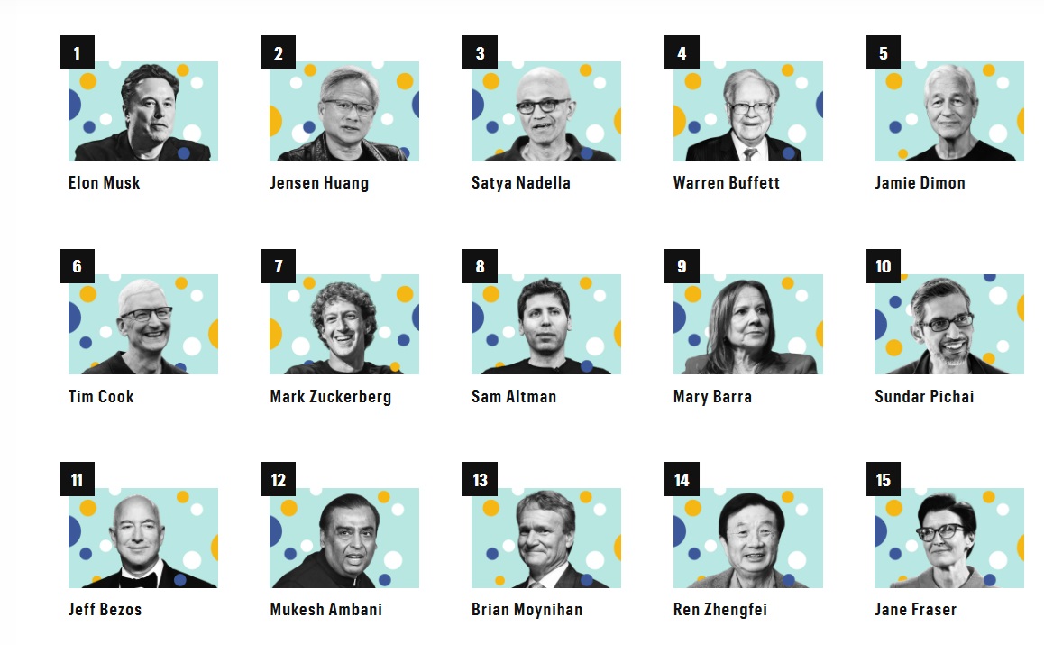 इस सूची में भारतीय मूल के सत्या नडेला शीर्ष स्थान पर हैं और वह तीसरे नंबर पर हैं। गूगल के सीईओ सुंदर पिचाई ने बिजनेस के क्षेत्र में शीर्ष 10 सबसे शक्तिशाली लोगों की सूची में जगह बनाई है। उनका शीर्ष 10 में होना दुनिया पर एक उद्योग के रूप में तकनीक और एआई के प्रभाव को दर्शाता है।