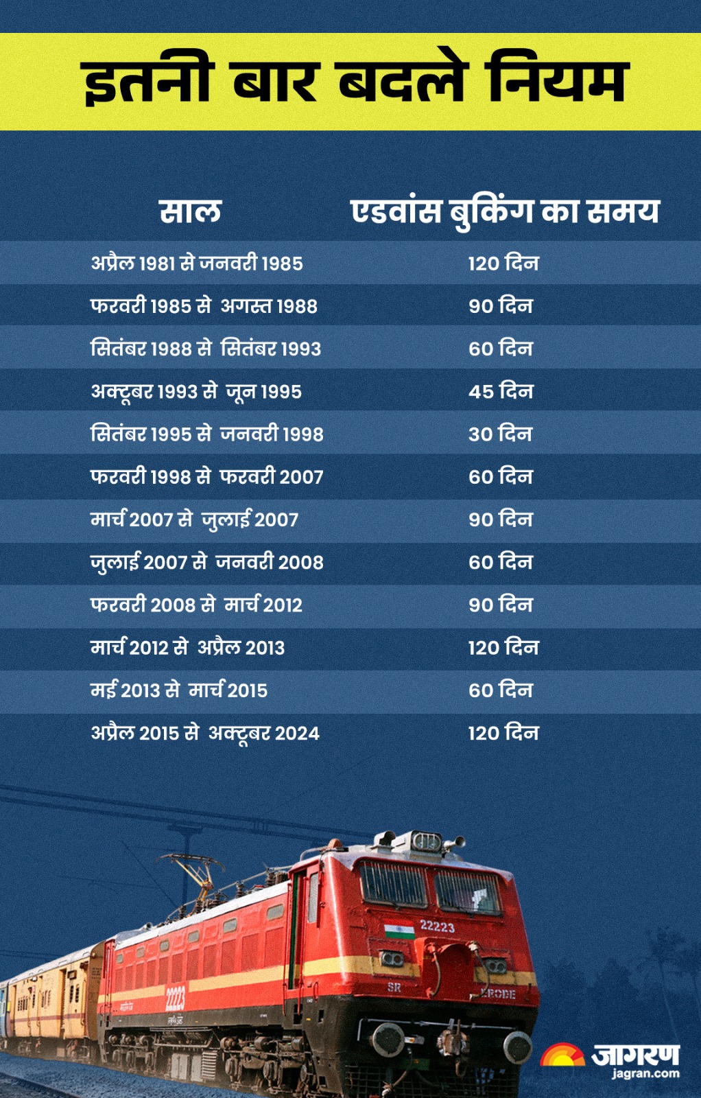 भारतीय रेलवे ने एडवांस रिजर्वेशन नियमों को कई बार बदला है। समय और यात्रियों के हित में रेलवे ने कई बार यह फैसला लिया है। नीचे दी गई इमेज में हमने बताया है कि एडवांस रिजर्वेशन के नियम में कब-कब बदलाव हुआ है।