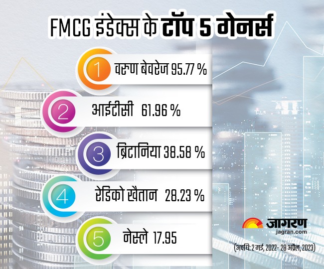 Nifty FMCG इंडेक्स पिछले एक साल के दौरान बजार का टॉप परफॉर्मिंग इंडेक्स रहा है। एफएमसीजी इंडेक्स कंज्यूमर स्पेस की टॉप 15 कंपनियों से मिलकर बना है। इसमें ब्रिटानिया इंडस्ट्रीज रेडिको खैतान नेस्ले वरुण बेवरेज आईटीसी और डाबर शामिल हैं। (जागरण ग्राफिक्स)