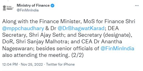 वित्त मंत्री निर्मला सीतारमण के इस साथ बैठक में वित्त राज्य मंत्री पंकज चौधरी और डॉ भागवत कराड भी शामिल हुए थे। इसके अलावा राजस्व सचिव अजय सेठ, संजय मल्होत्रा और मुख्य आर्थिक सलाहकार डॉ अनंत नागेश्वरन का भी नाम शामिल रहा।