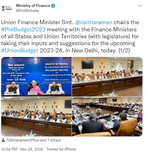 इस बैठक में आगमी बजट 2023-24 के लिए सभी राज्यों और केंद्र शासित प्रदेशों से सुझाव मांगे गए हैं। इससे पहले भी वित्त मंत्री की अध्यक्षता में कई बैठकें हो चुकी हैं।