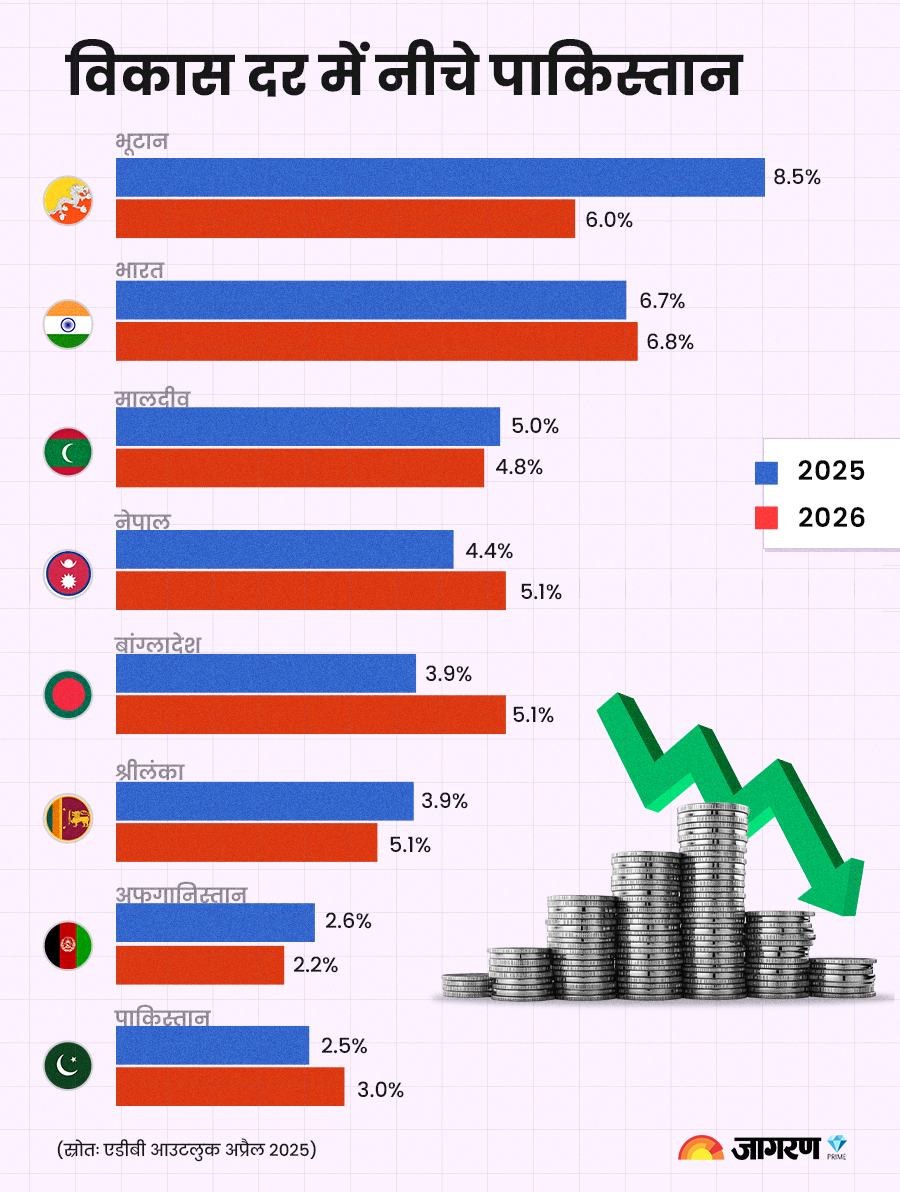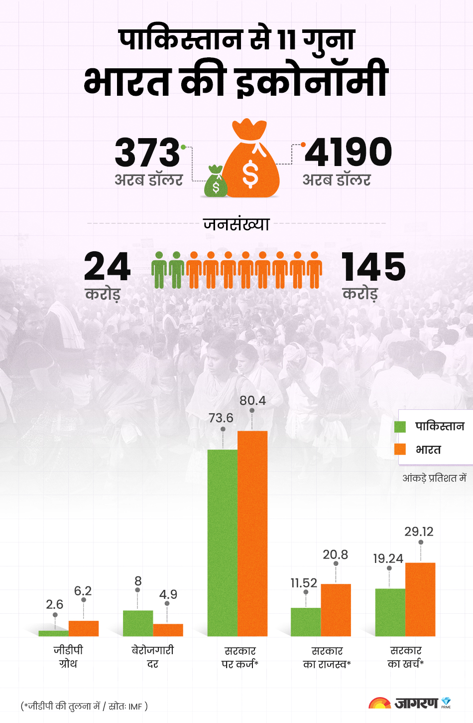 विशेषज्ञों का कहना है कि भारत से टकराव होने पर पाकिस्तान की जर्जर अर्थव्यवस्था पूरी तरह बिखर जाएगी। अंतरराष्ट्रीय मुद्रा कोष ने वित्त वर्ष 2024-25 (जुलाई-जून) में पाकिस्तान की जीडीपी ग्रोथ (Pakistan GDP Growth) का अनुमान 3% से घटाकर 2.6% कर दिया है। वर्ल्ड बैंक के अनुसार राजकोषीय घाटा 6.7% रहने का अनुमान है, जो पिछले वित्त वर्ष में GDP का 7.4% था। विदेशी मुद्रा भंडार (Pakistan Forex Reserves) 3 अरब डॉलर से सुधरकर 15.4 अरब डॉलर तक पहुंचा है, लेकिन यह विदेशी कर्ज के बूते हुआ है। पाकिस्तान में रेपो रेट अभी 12% है, जो जून 2024 में रिकॉर्ड 22% पर था। एक डॉलर की कीमत 280 पाकिस्तानी रुपये के बराबर है।