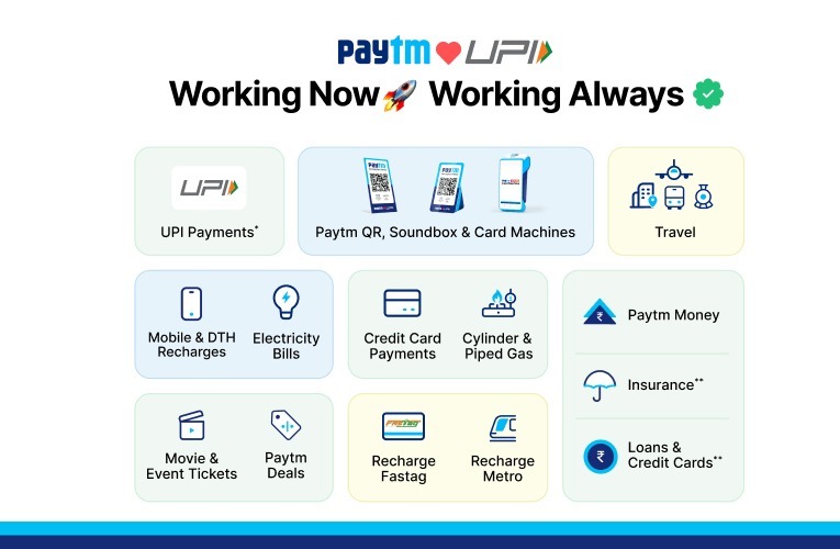 - पेटीएम क्यूआर कोड, साउंड बॉक्स, और कार्ड के जरिये आसानी से लेनदेन किया जा सकता है। इसका मतलब है कि जो यूजर रोज की लेनदेन के लिए पेटीएम का इस्तेमाल करते थे, उन्हें किसी भी प्रकार की कोई परेशानी नहीं होगी।