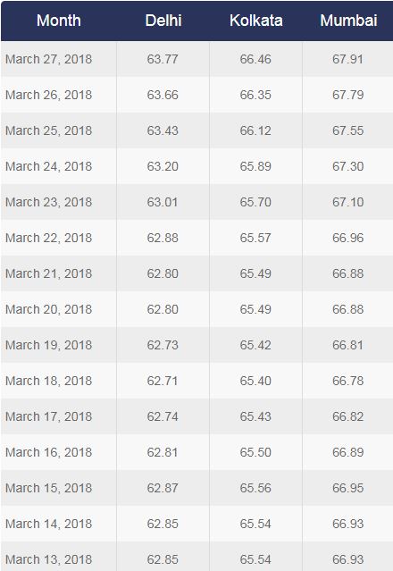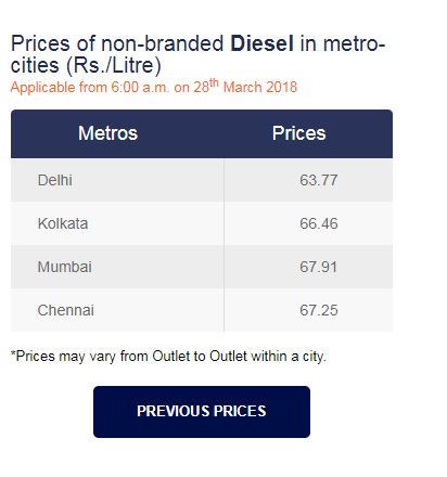 मार्च में दिल्ली-मुंबई में कितना बढ़े पेट्रोल-डीजल के दाम: 1 मार्च 2018 को दिल्ली में डीजल के दाम 62.25 रुपए प्रति लीटर थे। वहीं 28 मार्च को दिल्ली में पेट्रोल के दाम 63.77 रुपए प्रति लीटर पर आ गए हैं। इस दौरानदिल्ली में डीजल के दाम 1 रुपए 52 पैसे बढ़े हैं। वहीं मुंबई में 1 मार्च को डीजल के दाम 66.30 रुपए प्रति लीटर थे लेकिन 28 मार्च 2018 तक मुंबई में डीजल के दाम 67.91 रुपए प्रति लीटर पर आ गए हैं। इस दौरान इसमें 1 रुपए 61 पैसे का इजाफा हुआ है।