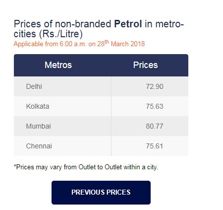 मार्च में कितना महंगा हो गया पेट्रोल: 1 मार्च 2018 को मुंबई में पेट्रोल के दाम 79.45 रुपए निर्धारित थे। वहीं 28 मार्च को पेट्रोल 80.77 के स्तर पर पहुंच गया है। इन 28 दिनों में पेट्रोल की कीमत में 1 रुपए 32 पैसे की तेजी आ चुकी है।