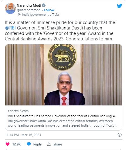 पीएम मोदी ने इस मौके पर आरबीआई गवर्नर शक्तिकांत दास को बधाई देते हुए ट्वीट किया कि यह हमारे देश के लिए बेहद गर्व का क्षण है कि श्री शक्तिकांत दास जी को सेंट्रल बैंकिंग ऑवर्ड 2023 में 'गर्वनर ऑफ द ईयर' का ऑवर्ड दिय गया है। इसके लिए उन्हें बहुत-बहुत बधाई।