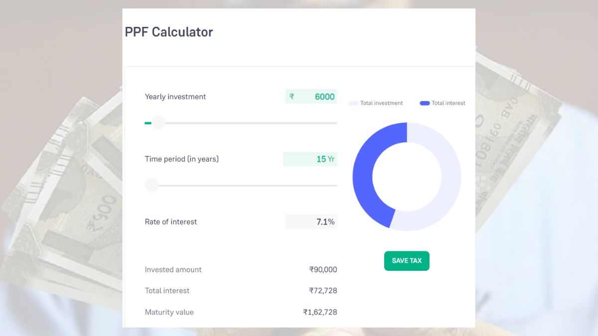 पीपीएफ पर 7.1 प्रतिशत की दर से ब्याज दिया जा रहा है। पीपीएफ कैलकुलेटर से चेक करें तो यह राशि 15 वर्षों में आपको 72,728 रुपये का ब्याज दिलाती है। 15 वर्षों बाद आपके निवेश पर आपको कुल 1,62,728 रुपये मिलता है।