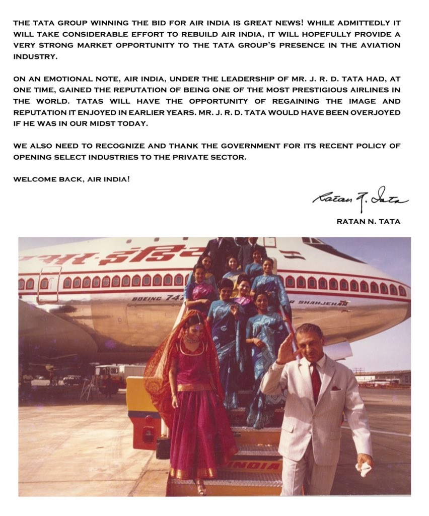 सरकार से एयर इंडिया का अधिग्रहण करने पर रतन टाटा ने खुशी जताते हुए एक ट्विटर पोस्ट किया था, जिसमें उन्होंने कैप्शन में 'Welcome back, Air India' कहा था। पोस्ट में उन्होंने खुशी जताते हुए कहा था कि टाटा ग्रुप ने एयर इंडिया की बोली जीत ली है। हम अब एयर इंडिया को दोबारा से खड़ा करने की पूरी कोशिश करेंगे।