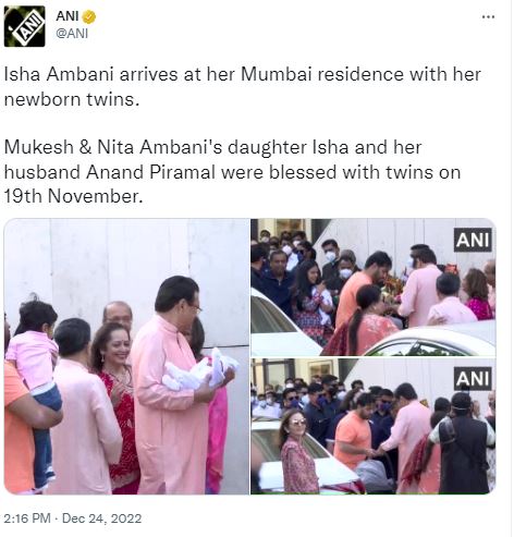 19 नवंबर, 2022 को ईशा अंबानी ने दो जुड़वां को जन्म दिया था। इस मौके पर अंबानी परिवार की ओर से बयान जारी कर कहा गया था कि हमारे बच्चों ईशा और आनंद को 19 नवंबर 2022 को भगवान ने जुड़वां बच्चों का आशीर्वाद दिया है। ईशा और दोनों बेबी आदिया और कृष्णा स्वस्थ हैं। हम आदिया, कृष्णा, ईशा और आनंद के लिए उनके जीवन के सबसे महत्वपूर्ण पड़ाव में आपका आशीर्वाद और शुभकामनाएं चाहते हैं।'