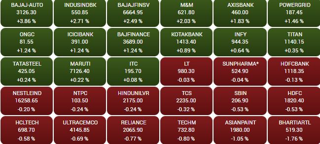 मंगलवार को बैंकिंग और ऑटोमोबाइल सेक्टर की कंपनियों में लिवाली के दम पर Sensex और Nifty कारोबार के आखिर में मामूली बढ़त के साथ बंद हुए। सप्ताह के दूसरे कारोबारी सत्र में BSE का 30 शेयरों पर आधारित संवेदी सूचकांक सेंसेक्स 44.80 अंक यानी 0.12 फीसद की बढ़त के साथ 38843.88 अंक पर बंद हुआ। दूसरी ओर NSE Nifty 5.80 अंक यानी 0.05 फीसद की तेजी के साथ 11472.30 अंक के स्तर पर बंद हुआ। सेक्टोरल इंडेक्स की बात की जाए तो बैंक और ऑटो को छोड़कर अन्य सूचकांक लाल निशान के साथ बंद हुए।