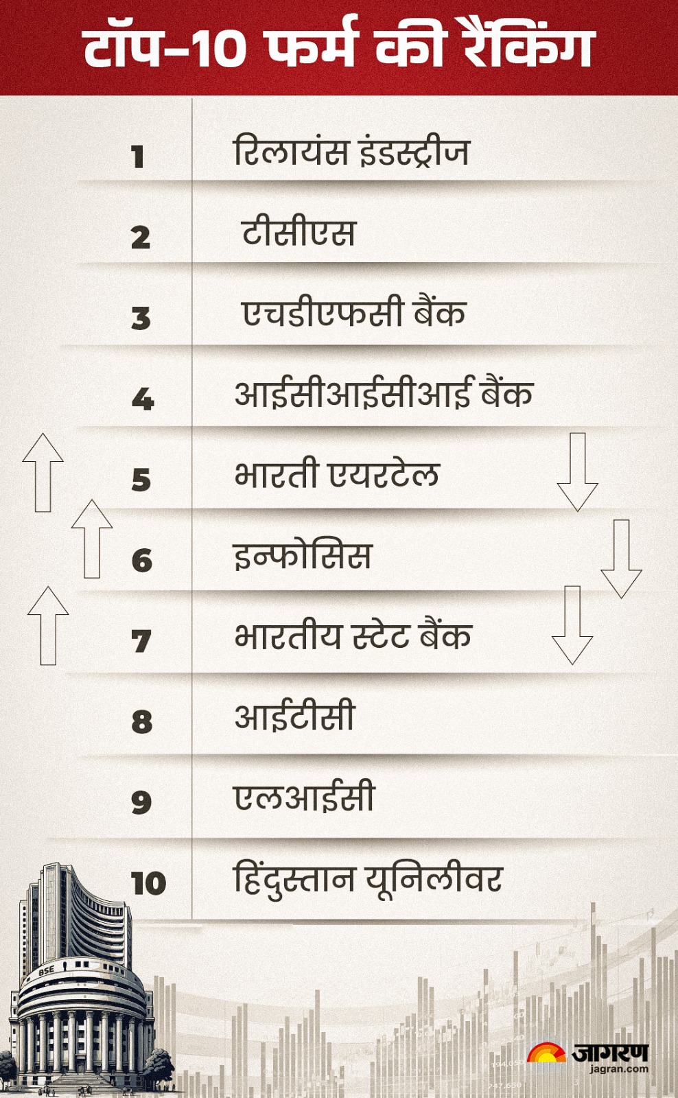 स्टॉक मार्केट में वैल्यूएशन के हिसाब से रिलायंस इंडस्ट्रीज पहले पायदान पर है। इसके बाद टीसीएस, एचडीएफसी बैंक, आईसीआईसीआई बैंक, भारती एयरटेल, इन्फोसिस, भारतीय स्टेट बैंक, आईटीसी, एलआईसी और हिंदुस्तान यूनिलीवर आते हैं।