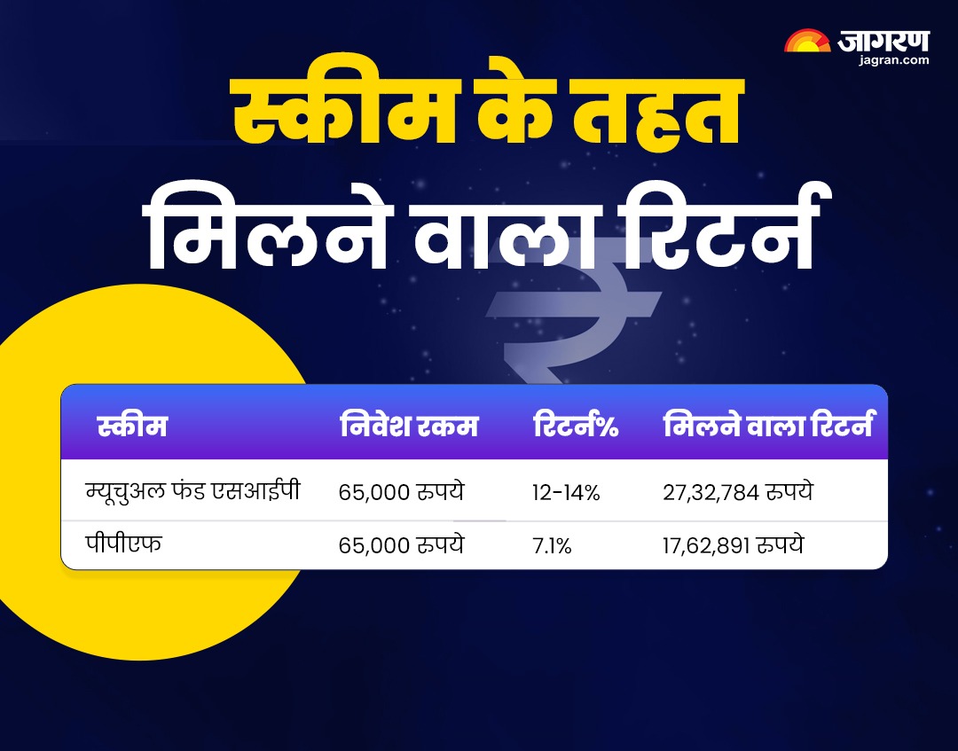 उदाहरण के लिए मान लीजिए अगर आप म्यूचुअल फंड एसआईपी और पीपीएफ दोनों में ही एक साल में 65,000 रुपये निवेश करते हैं, तो 7.1 फीसदी रिटर्न के हिसाब से आपको 15 साल में लगभग 17,62,891 रुपये मिलेंगे। इसके साथ ही अगर यहीं पैसे म्यूचुअल फंड एसआईपी में 15 साल के लिए निवेश किए जाते हैं, तो आपको 27,32,784 रुपये रिटर्न में मिल सकता है। ये रिटर्न म्यूचुअल फंड में मिलने वाले अनुमानित रिटर्न 12 से 14 फीसदी के हिसाब से कैलकुलेट किया जाता है।
