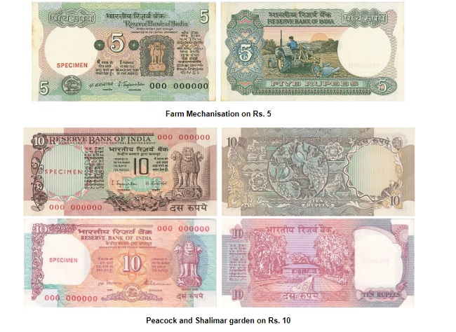 1967 में नोट को आकार को कम किया गया। इसके 13 साल बाद 1980 में सिंबल्स के साथ नए नोट जारी किए गए। दो रुपये के नोट पर आर्यभट्ट उपग्रह, एक रुपये के नोट पर तेल का कुंआ और 10 रुपये के नोट पर मोर का चित्र अंकित था। बढ़ती इकॉनमी और परचेजिंग पावर में कमी के चलते अक्टूबर 1987 में 500 रुपये का नोट शुरू किया गया।