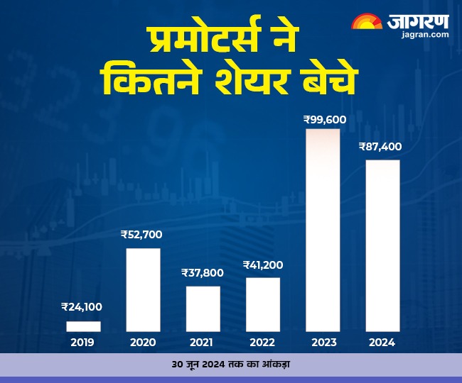 अधिकारिक डेटा के अनुसार, साल 2024 के पहले 6 महीने में शेयर मार्केट की टॉप-500 कंपनियों के प्रमोटर 84 हजार करोड़ रुपये से ज्यादा वैल्यू के शेयर बेच चुके हैं। यह आंकड़ा पिछले पांच साल की तुलना में सबसे ज्यादा है। पिछले साल यानी 2023 में प्रमोटर ने कुल 99,600 करोड़ रुपये के शेयर बेचे थे। लेकिन, इस साल की पहली छमाही में ही प्रमोटर 80,000 करोड़ रुपये ज्यादा के शेयर बेच चुके हैं।