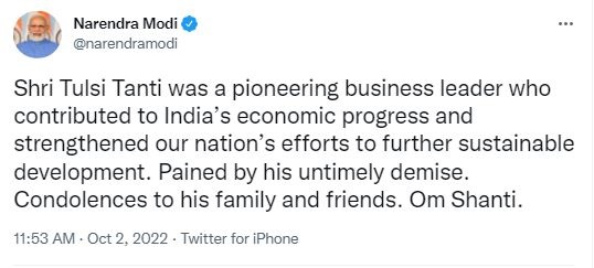 तुलसी तांती की मृत्यु पर पीएम मोदी ने भी ट्वीट कर शोक व्यक्त करते हुए कहा था कि वे एक अग्रणी कारोबारी थे, जिन्होंने भारत की आर्थिक प्रगति में योगदान दिया और देश को मजबूत बनाया। उनके अचानक चले जाने से मैं दुखी हूं। उसके परिवार के प्रति मेरी संवेदना है। ओम शांति।
