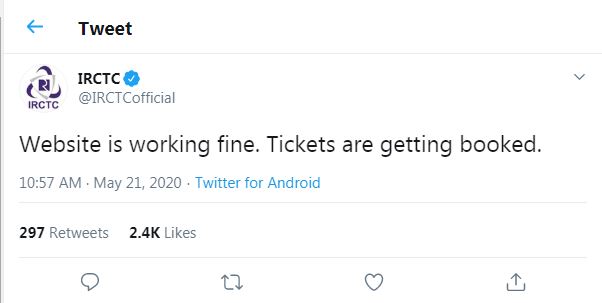 मंत्रालय की ओर से बताया गया था कि गुरुवार यानी 21 मई की सुबह 10 बजे से टिकट बुकिंग शुरू होगी, लेकिन IRCTC की वेबसाइट पर कुछ ही ट्रेन नजर आ रहे थे। जब लोग सुबह 10 बजे से टिकट बुकिंग के लिए बैठे तो उन्हें बहुत देर तक यात्रा वाले रूट के लिए ट्रेन नजर नहीं आ रही थी। कई लोग इसे लेकर परेशान दिखे। लोगों का गुस्सा तब और भड़क गया जब रेलवे की ओर से IRCTC के ट्विटर हैंडल से ट्वीट किया गया कि वेबसाइट में कोई समस्या नहीं है और टिकट बुकिंग बिना किसी बाधा के जारी है। यात्रियों ने इसे लेकर IRCTC के ट्वीट के जवाब काफी भला बुरा कहा। हालांकि खबर लिखे जाने के समय तक पीटीआइ की ओर से जो डाटा मुहैया कराया गया था उसके मुताबिक, सुबह 10 बजे से 2 घंटे के भीतर, 73 विशेष यात्री ट्रेनों के लिए 1,49,025 टिकट बुक किए गए थे।