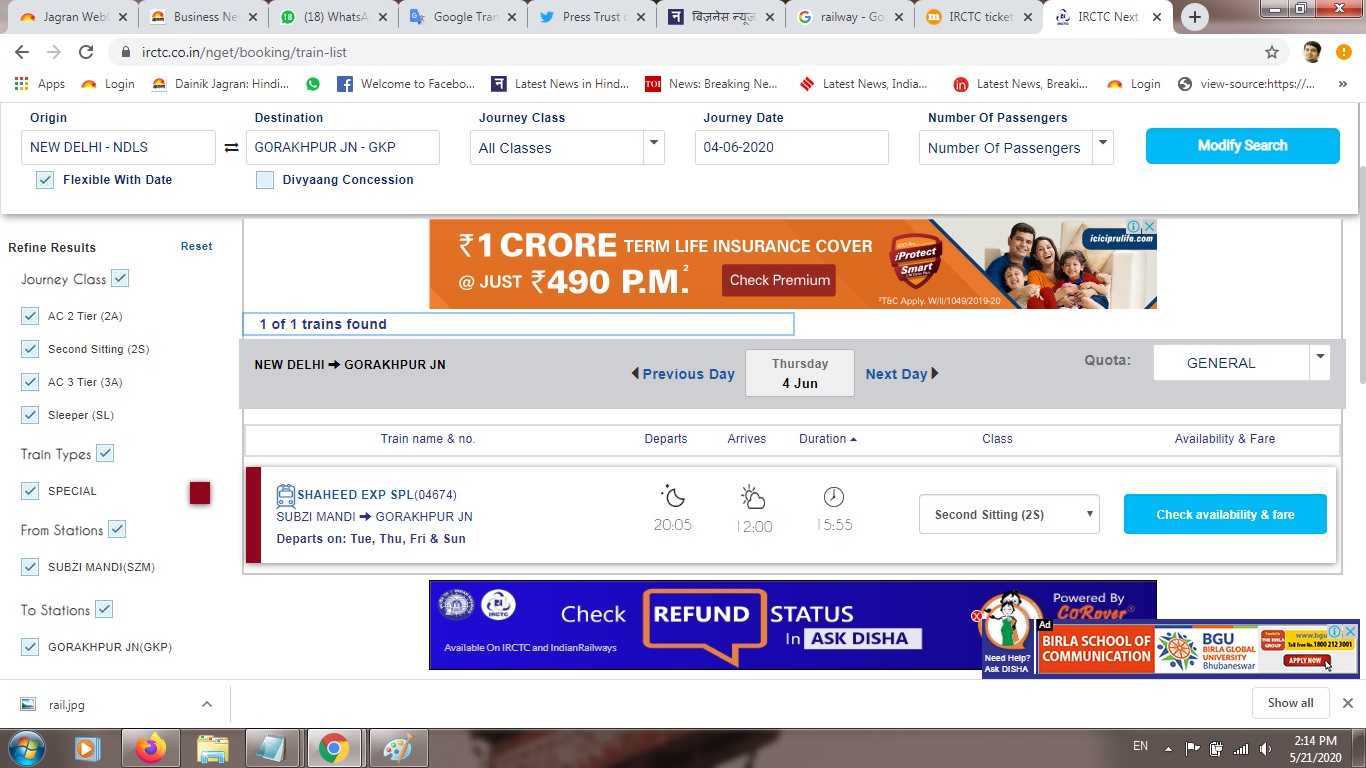इसके बाद हमने नई दिल्ली से गोरखपुर के लिए ट्रेन देखी जिसमें हमें एक बार फिर हमें स्पेशल ट्रेन नजर आई। इन दोनों ट्रेनों की लिस्ट कल न्यूज एजेंसी ANI की ओर से जारी की गई थी। ये ट्रेन भी 200 की लिस्ट में शामिल थीं। इसके आलवा भी हमने कई रूट की ट्रेनें खोजी जिसकी घोषणा की गई थी, लेकिन वो भी नजर नहीं आई।