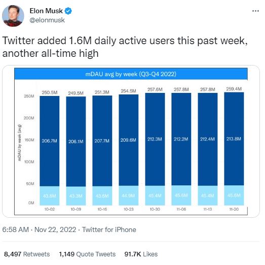 मस्क ने एक अन्य ट्वीट में कहा कि ट्विटर का उपयोग इस समय अपने सबसे उच्चतम स्तर पर पहुंच गया है। पिछले हफ्ते प्लेटफार्म से 16 लाख यूजर्स जुड़े हैं। दुनिया में 20 नवंबर को ट्विटर यूजर्स की संख्या 25.90 करोड़ के पार पहुंच गई है।