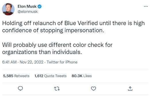 इसके साथ ही मस्क ने आगे कहा कि जहां तक संभावना है कि संगठन और व्यक्तियों के लिए अगल रंग का वेरफिकेशन टिक दिया जाएगा।