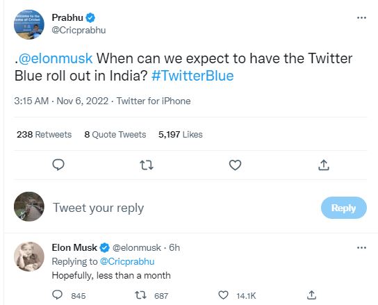 बता दें, प्रभु नाम के एक वेरिफाइड यूजर ने मस्क को टैग करते हुए लिखा कि ट्विटर ब्लू भारत में कब तक शुरू हो सकता है। इसका जवाब देते हुए मस्क ने कहा कि एक महीने से कम समय में।