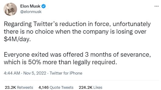 ट्विटर से कर्मचारियों की संख्या में कटौती करना के संबंध में मस्क ने ट्वीट किया कि यह दुर्भाग्यपूर्ण है, लेकिन 4 मिलियन यूएस डॉलर प्रतिदिन के नुकसान के कारण कंपनी के पास कोई विकल्प नहीं था। सभी निकले गए कर्मचारियों को 3 महीने का भत्ता दिया गया है, जो कि कानूनी बाध्यता से 50 प्रतिशत अधिक है।