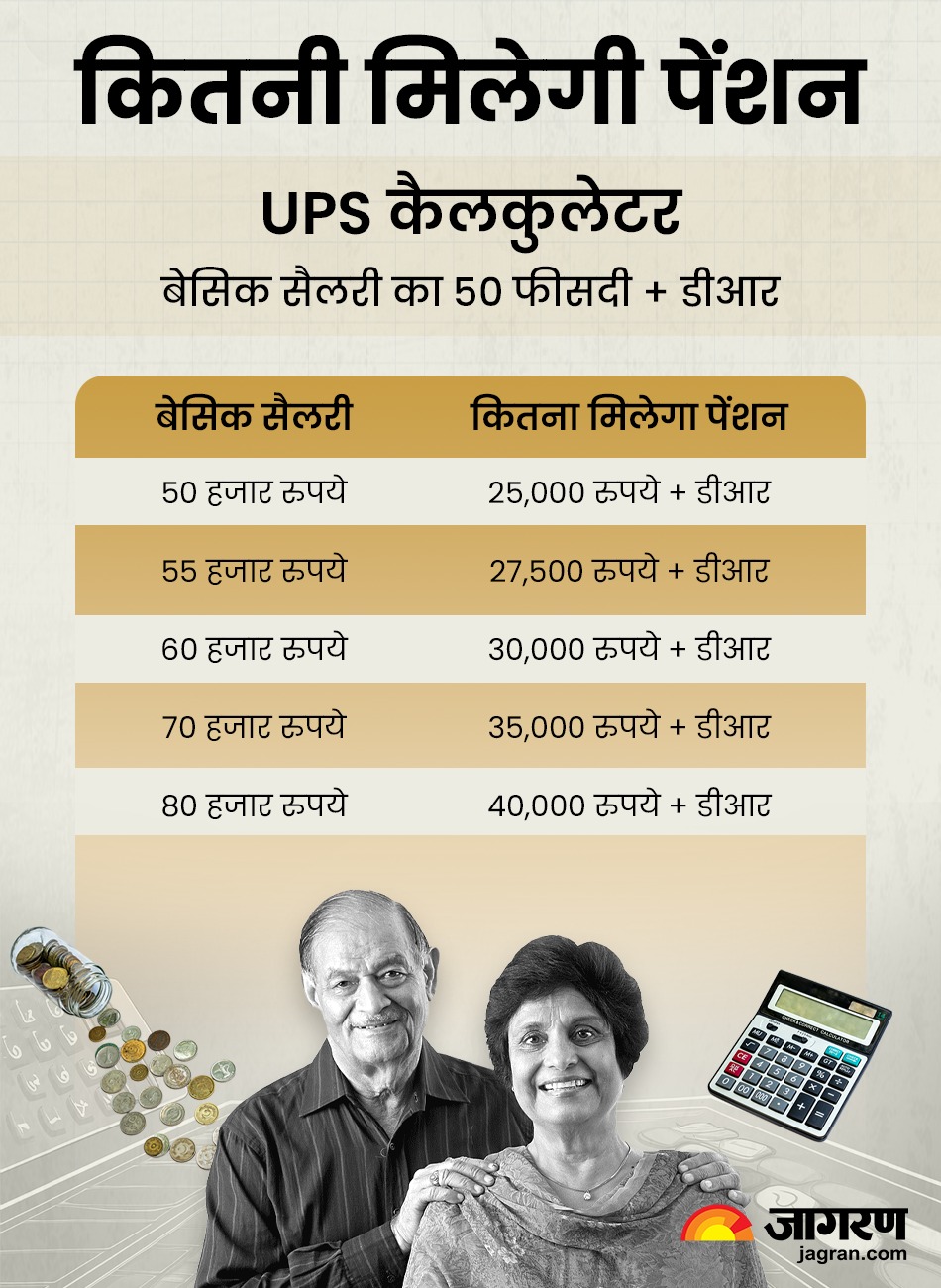 - जिन कर्मचारी की बेसिक सैलरी 50,000 रुपये है, उन्हें यूपीएस के तहत बेसिक सैलरी का 50 फीसदी यानी 25,000 रुपये + महंगाई राहत को जोड़कर जो राशि बनेगी उतनी पेंशन मिलेगी।