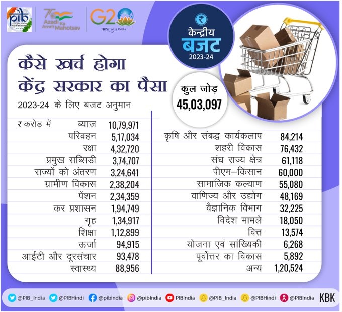 केंद्रीय वित्तमंत्री निर्मला सीतारमण ने बुधवार को बजट 2023-24 के जरिए कमाई और खर्चे का पूरा हिसाब-किताब देश के सामने रख दिया है। बजट के अनुमान के अनुसार सरकार के पास कुल खर्च 45 लाख 3 हजार 97 करोड़ का है।