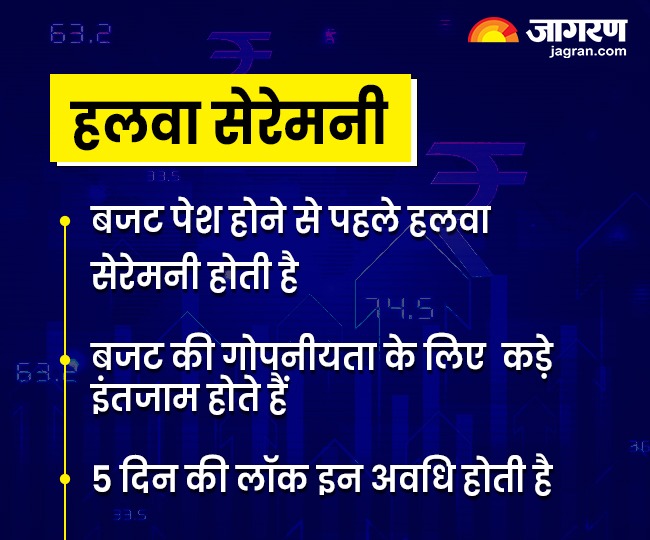 बजट पेश करने से एक हफ्ते पहले हलवा सेरेमनी आयोजित किया जाता है। इसमें वित्त मंत्री और वित्त मंत्रालय के अधिकारियों के बीच हलवा बांटा जाता है। इस सेरेमनी के साथ ही बजट को अंतिम रूप दिया जाएगा।