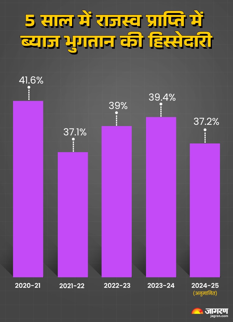 राजस्व प्राप्ति में ब्याज भुगतान की हिस्सेदारी भी कम हो रही है। कोरोना काल के दौरान वित्त वर्ष 2020-21 में राजस्व प्राप्ति का 41.6 प्रतिशत हिस्सा ब्याज भुगतान में चला जाता था जो चालू वित्त वर्ष में 37.2 प्रतिशत रहने का अनुमान है।