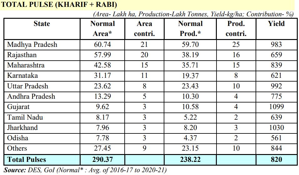 सामान्य क्षेत्रफल लगभग 290 लाख हेक्टेयर (खरीफ- 140 लाख हेक्टेयर + रबी- 150 लाख हेक्टेयर) में दालों की खेती की जाती है।। खरीफ क्षेत्र का मौसमी प्रतिशत हिस्सा 48% है, शेष 52% क्षेत्र रबी दलहन के लिए जाता है।