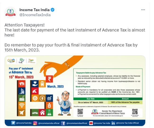 नई दिल्ली, बिजनेस डेस्क। अगर आप एक टैक्सपेयर है और अब तक अग्रिम कर (advance tax) नहीं भरा है तो जल्दी करें। आज यानी 15 मार्च को इसकी अंतिम तिथि है। एक व्यक्ति जिसकी वित्तीय वर्ष के लिए अनुमानित देनदारी 10,000 रुपये या उससे अधिक है, उसे एडवांस टैक्स का भुगतान करना पड़ता है। आयकर विभाग ने अपने सोशल मअकाउंट द्वारा करदाताओं से अग्रिम कर की अंतिम किस्त का भुगतान तय तारीख तक करने की अपील की है।
