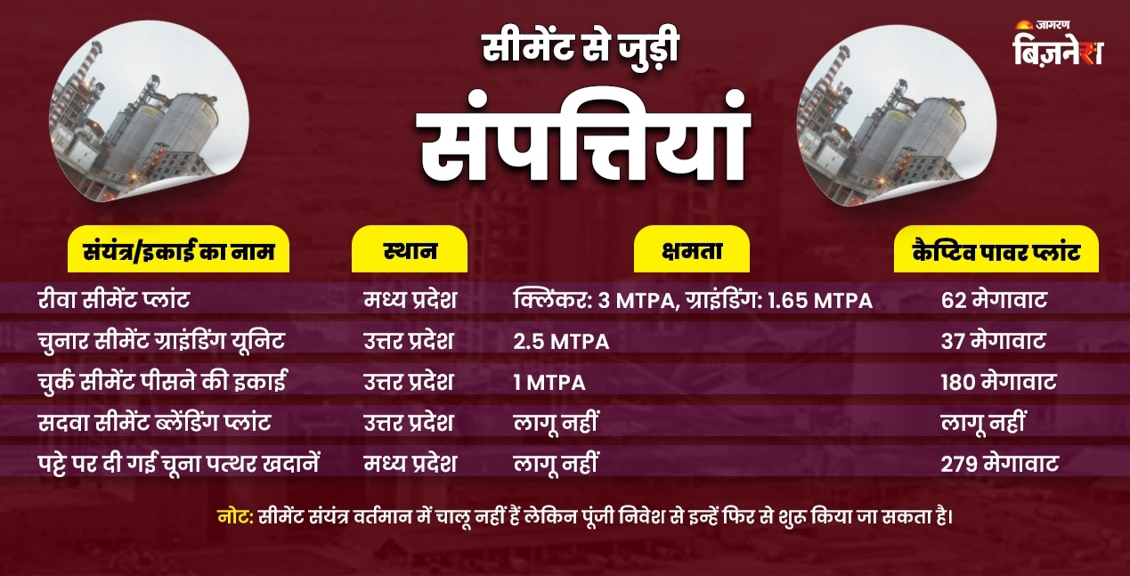 सीमेंट उद्योग में जेएएल के पास मध्य प्रदेश में जैसे रीवा, चुनार और चुर्क प्लांटहै। इसके अलावा इनके पास चूना पत्थर की खदानें और 279 मेगावाट की कैप्टिव पावर क्षमता है।