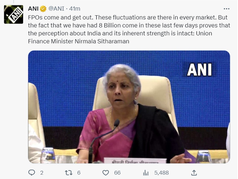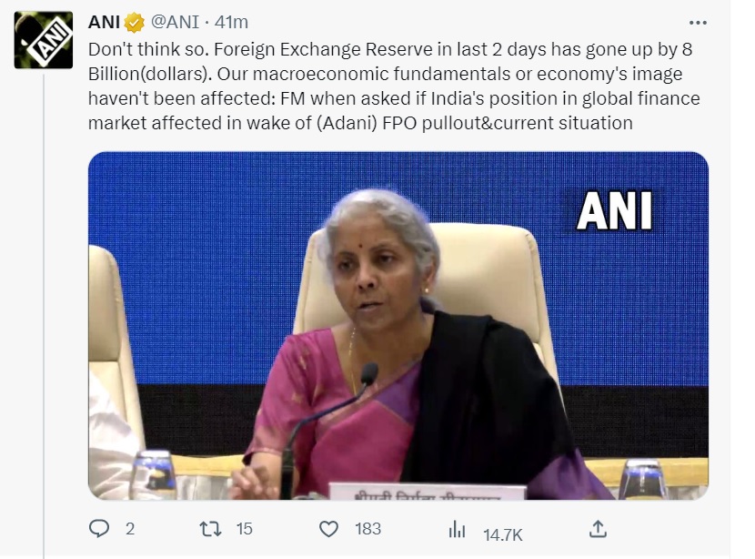 वित्त मंत्री से जब पूछा गया कि क्या वैश्विक वित्त बाजार में भारत की स्थिति अडानी एफपीओ पुलआउट के मद्देनजर कमजोर हुई है, तो उन्होंने कहा कि पिछले 2 दिनों में विदेशी मुद्रा भंडार 8 बिलियन (डॉलर) बढ़ गया है। हमारे मैक्रोइकॉनॉमिक फंडामेंटल या अर्थव्यवस्था की छवि प्रभावित नहीं हुई है।