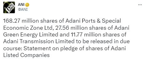 ग्रुप की ओर से बताया गया कि ये शेयर अडानी पोर्ट एंड स्पेशल इकोनॉमिक जोन्स, अडानी ग्रीन एनर्जी और अडानी ट्रांसमिशन के हैं। इसके साथ ही कहा कि शेयरों को गिरवी रखकर लिए गए लोन के प्रति ग्रुप के प्रमोटर्स ने प्री पेमेंट करने का आश्वासन दिया है।