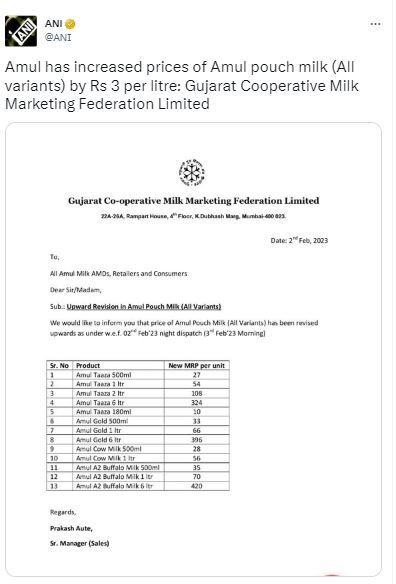 अमूल की ओर से लगभग सभी प्रकार के दूध के दामों में इजाफा कर दिया गया है। ताजा बढ़ोतरी आज लागू हो गई है। यानी आज से आपको दूध खरीदने के लिए पहले के मुकाबले अधिक दाम देने होंगे।