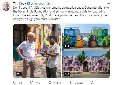 कुक दिल्ली पहुंच चुके हैं और उन्होंने एक ट्वीट किया, जिसमें दिल्ली के लोधी आर्ट डिस्ट्रिक्ट को शानदार पब्लिक प्लेस बताया। साथ ही भारतीय कल्चर को काफी प्रभावशाली दिखने के लिए एसटी+आर्ट फाउंडेशन और कलाकारों बधाइयां दीं। इसके अलावा यह दिखाने के लिए दत्ताराज नाइक का धन्यवाद किया कि कैसे वे इन चित्रों को iPad पर डिजाइन करते हैं।