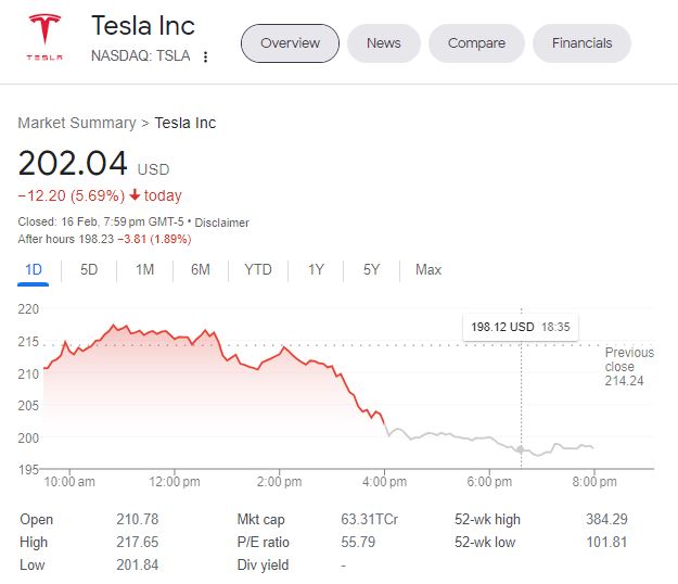 इस खबर के टेस्ला के शेयर पर दबाव देखने को मिला और शेयर गुरुवार के कारोबारी सत्र में 5.59 प्रतिशत फिसलकर 202.04 डॉलर पर पहुंच गया। पिछले पांच कारोबारी सत्रों में आई सबसे बड़ी गिरावट थी। वहीं पिछले एक साल की बात करे तो शेयर 30 प्रतिशत टूट चुका है।